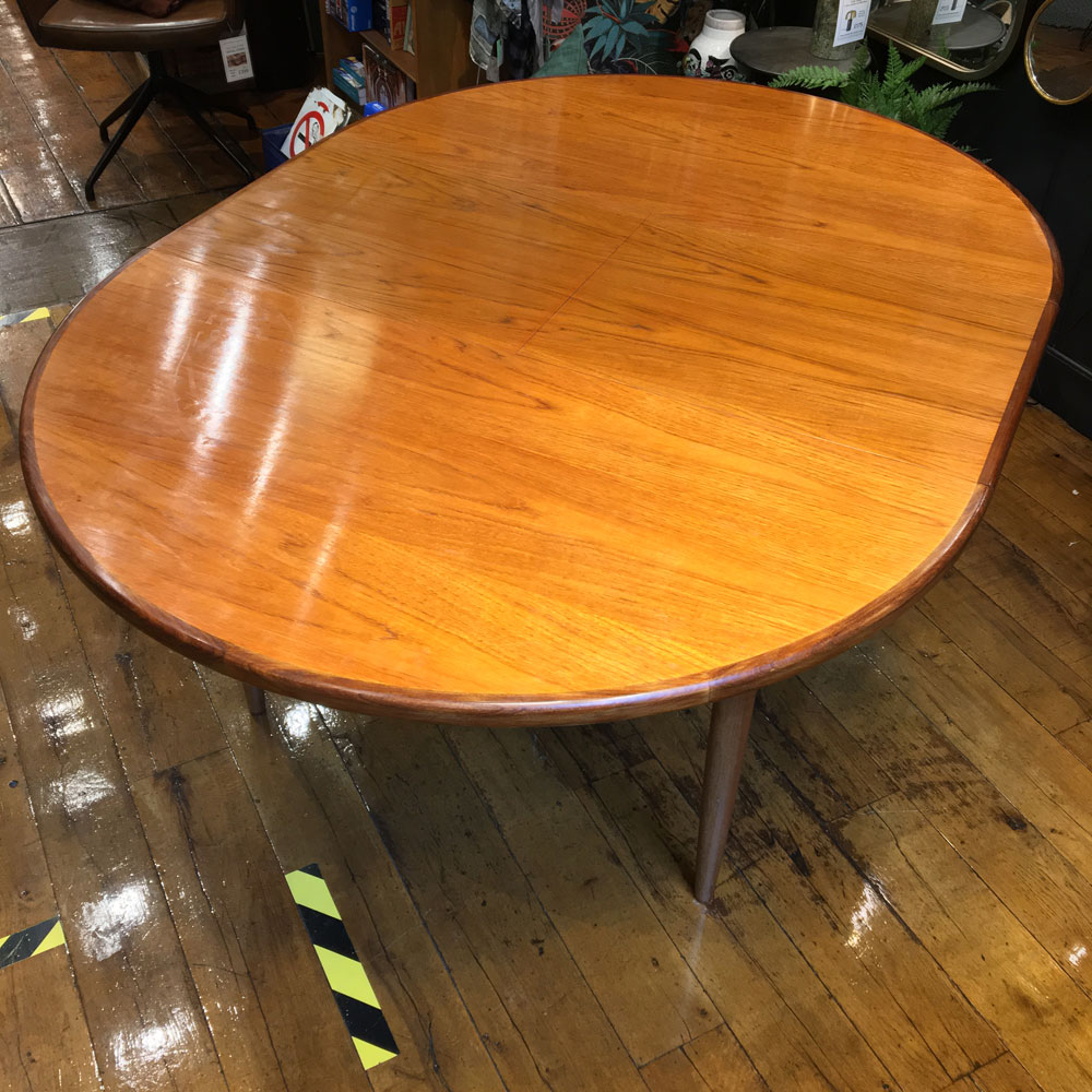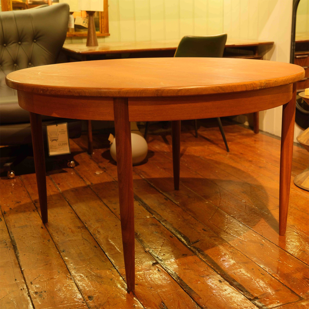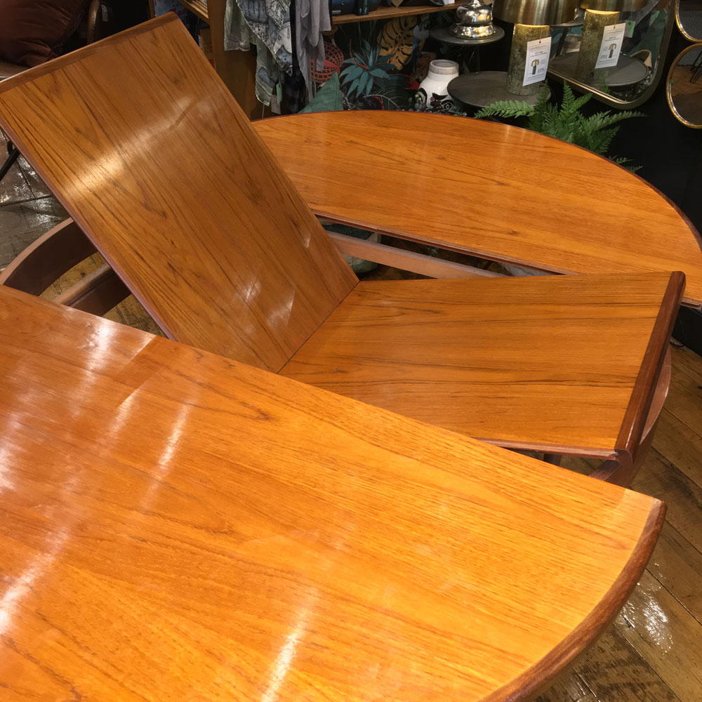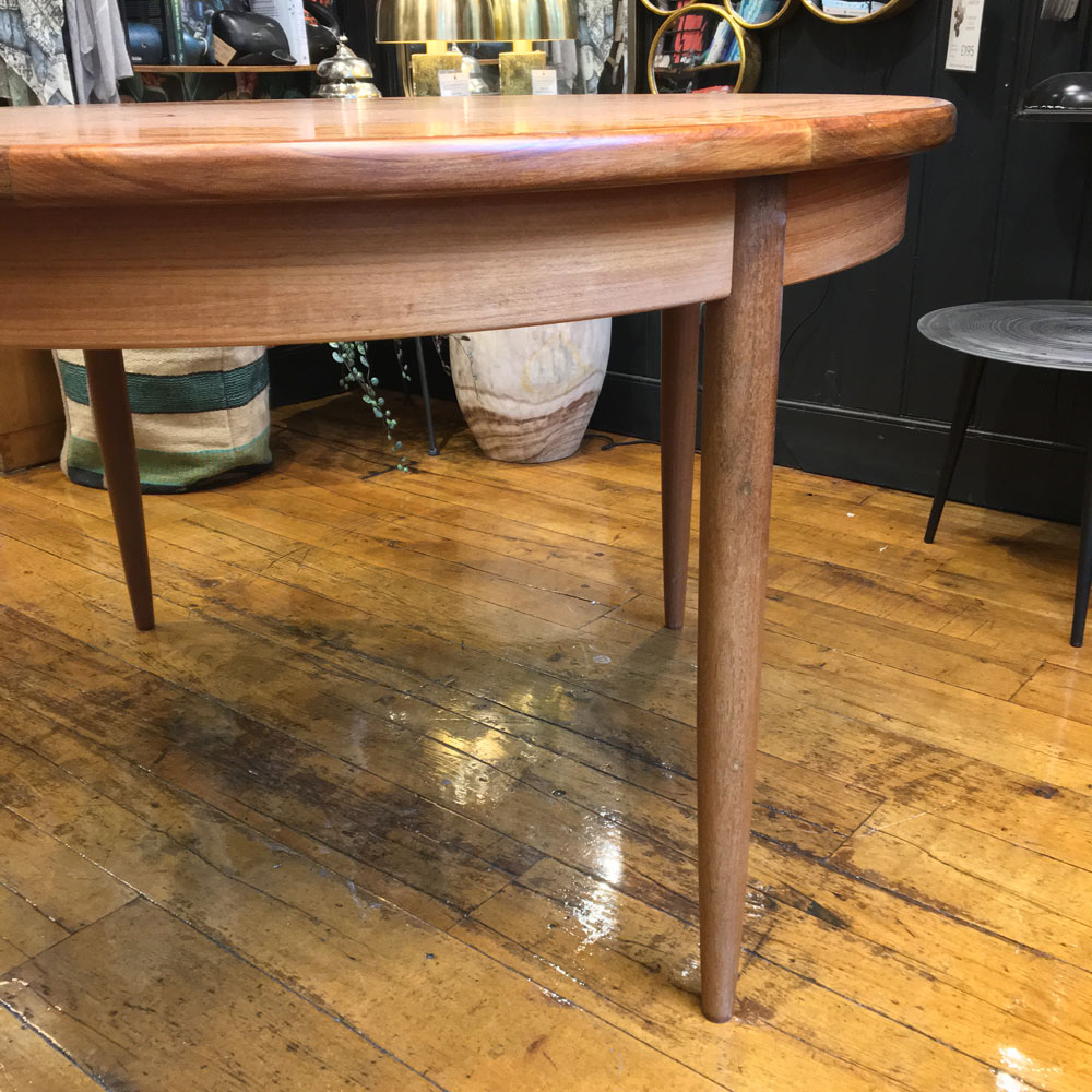 This classic circular, wonderfully compact dining table from G Plan extends to an oval using an internal leaf on a fixed butterfly mechanism. The table top is teak veneer on engineered board, and is edged in solid, moulded afromosia. It has solid teak, turned, tapering legs, coming off a mahogany apron.