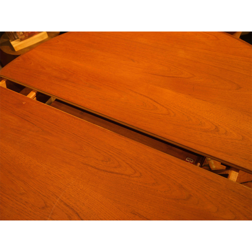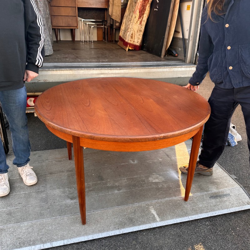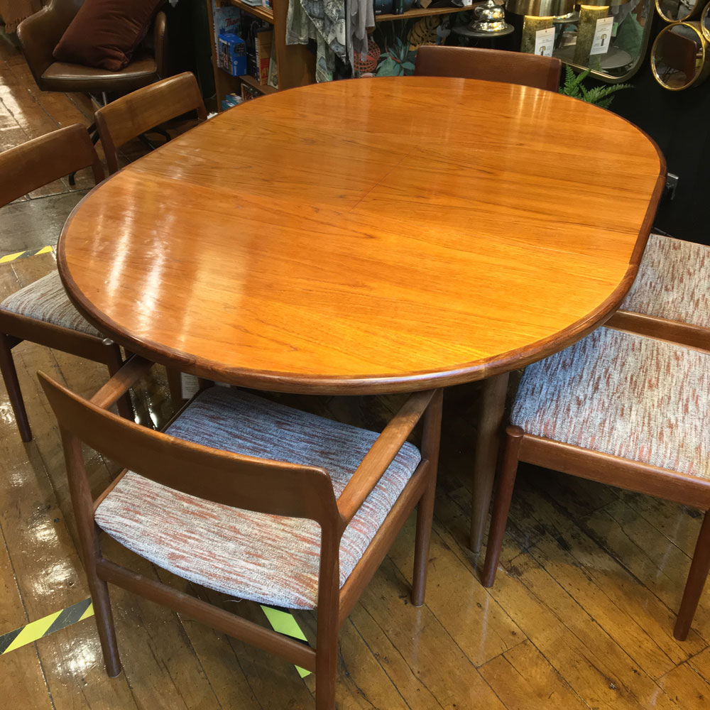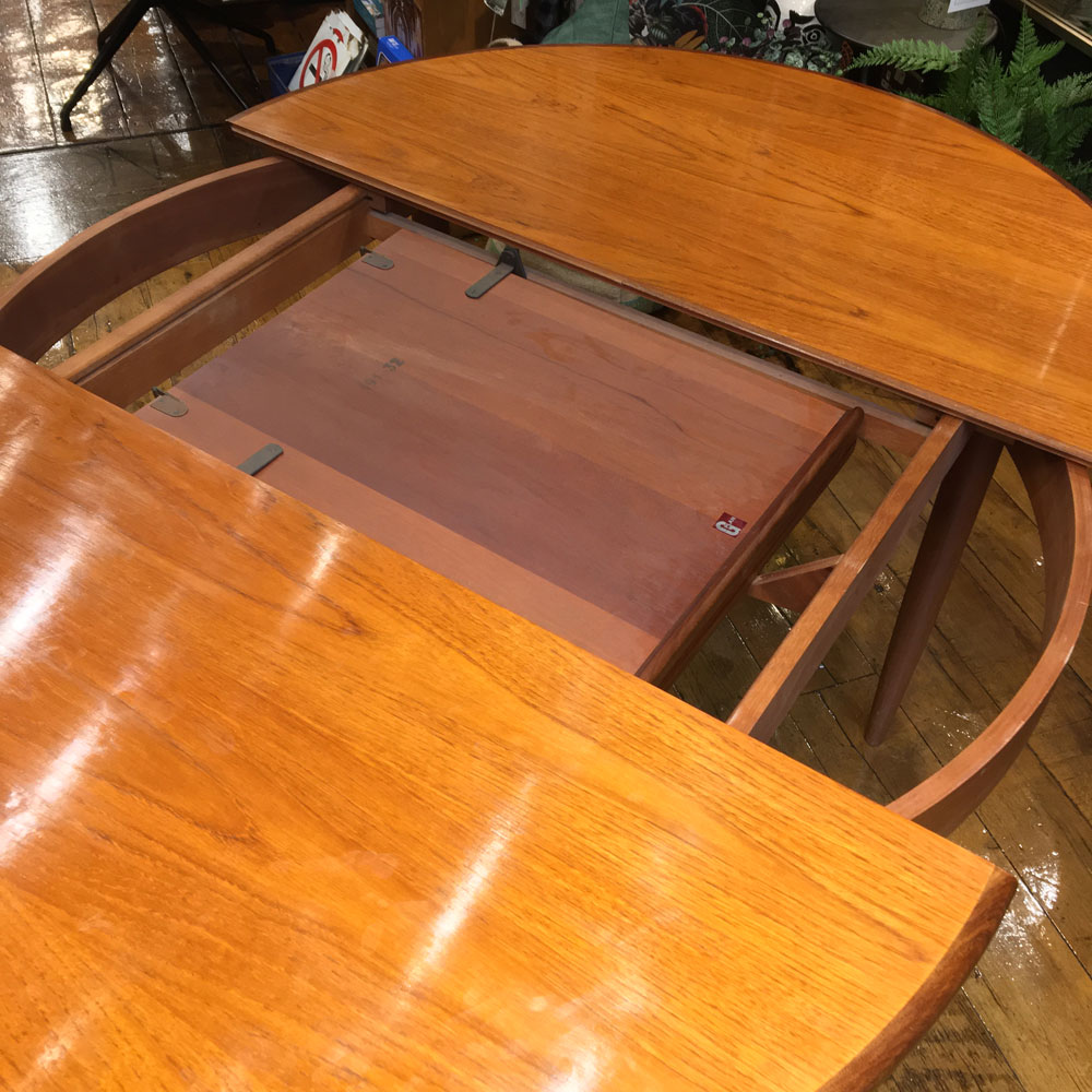 This classic circular, wonderfully compact dining table from G Plan extends to an oval using an internal leaf on a fixed butterfly mechanism. The table top is teak veneer on engineered board, and is edged in solid, moulded afromosia. It has solid teak, turned, tapering legs, coming off a mahogany apron.