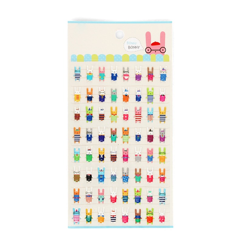 Collection of 3D puffy stickers with cartoonish bunny rabbit theme on a single sheet. Small, squishy and tactile, these stickers can be used to add colour and fun to greetings cards, gift wrapping, craft projects, scrapbooks and more.
