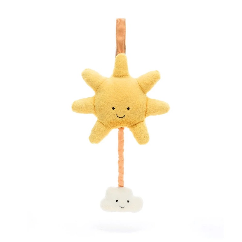 Introducing Amuseables Sun Musical Pull, a ray of sunshine to brighten any nursery! Gently pull on the cheery cream cloud and an original Jellycat lullaby will play from the cheerfully soft sun. Fasten onto a crib or pram with the Velcro attachment and whatever the weather, there will be joyful sunshine for Baby.