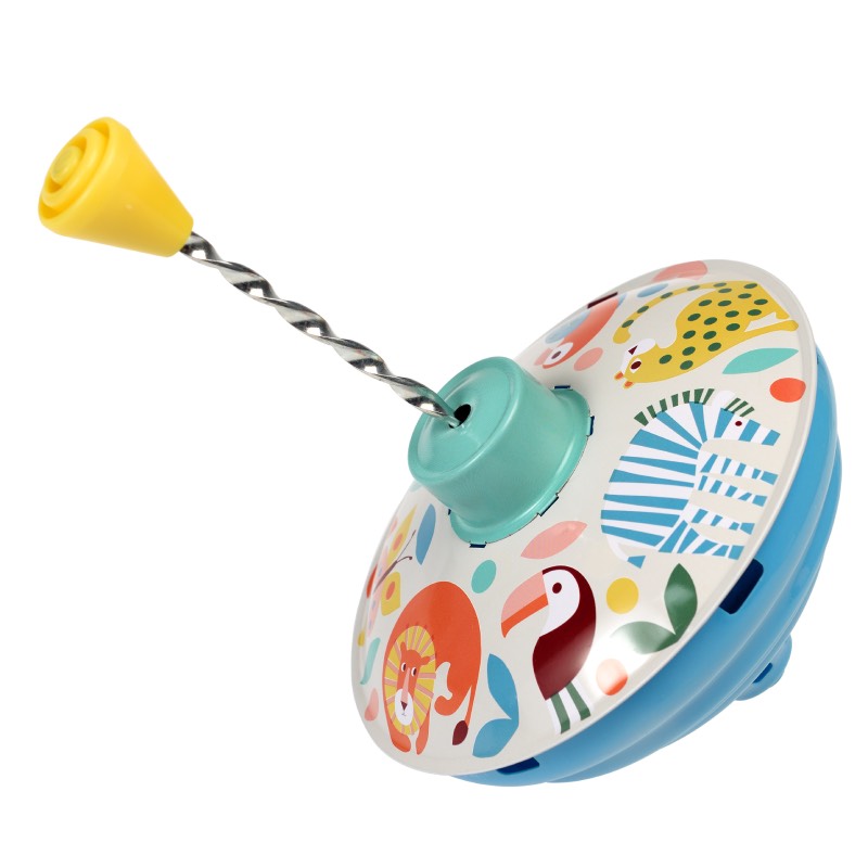 Retro-style spinning top with an animal design. Simply push firmly down on the handle to set the top spinning.