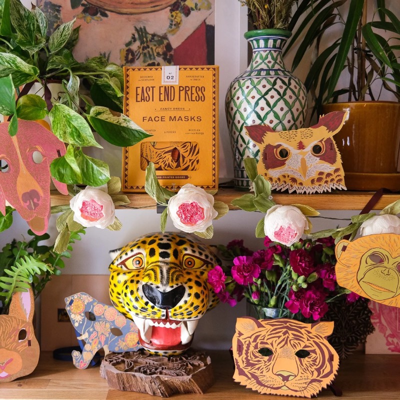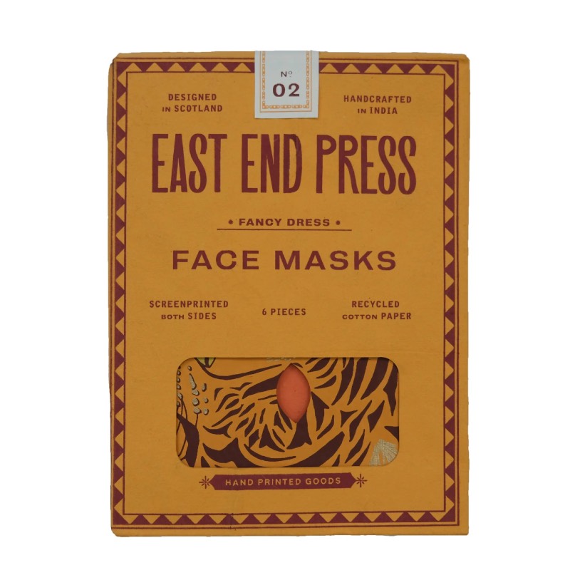 These masks are screen printed on both sides on thick, handmade cotton paper. The recycled paper masks have two cut-out eye holes with securely attached ribbon on either end, making them ideal accessories for parties and fancy dress.