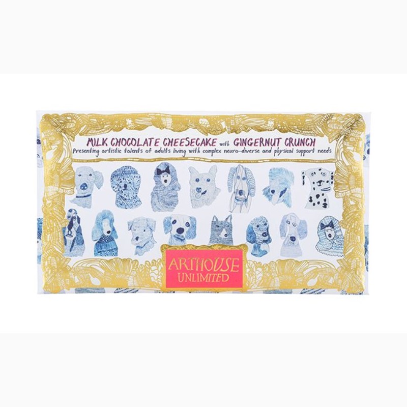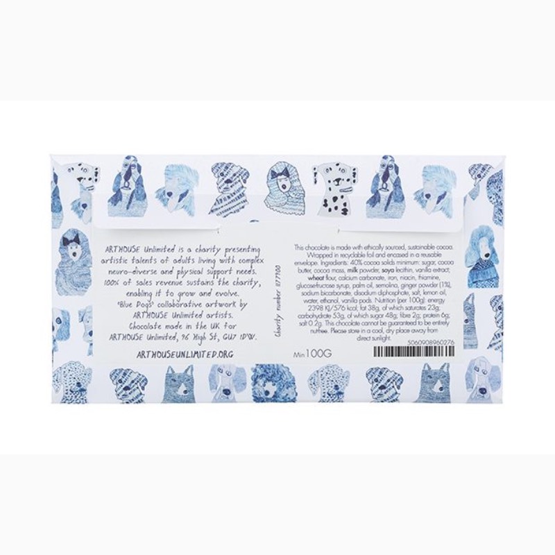 Made in the UK by a specialist chocolatier, this chocolate is an indulgent treat for the taste buds. This milk chocolate features artwork created by a collaboration of ARTHOUSE Unlimited artists.