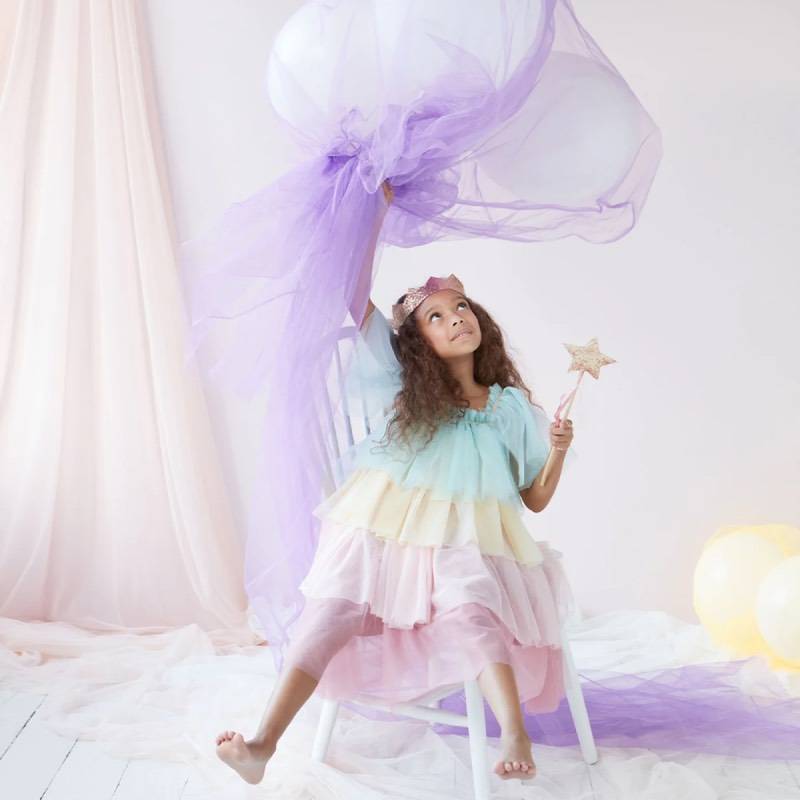 Material: The dress is crafted from layers of tulle in mint, pale yellow, peach pink and dusky pink. It is lined with pink cotton.