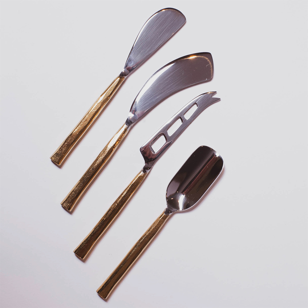 Our Darsa Cheese Knife Set is forged from brass and finished in brushed gold. The rustic artisan look adds interest and character.