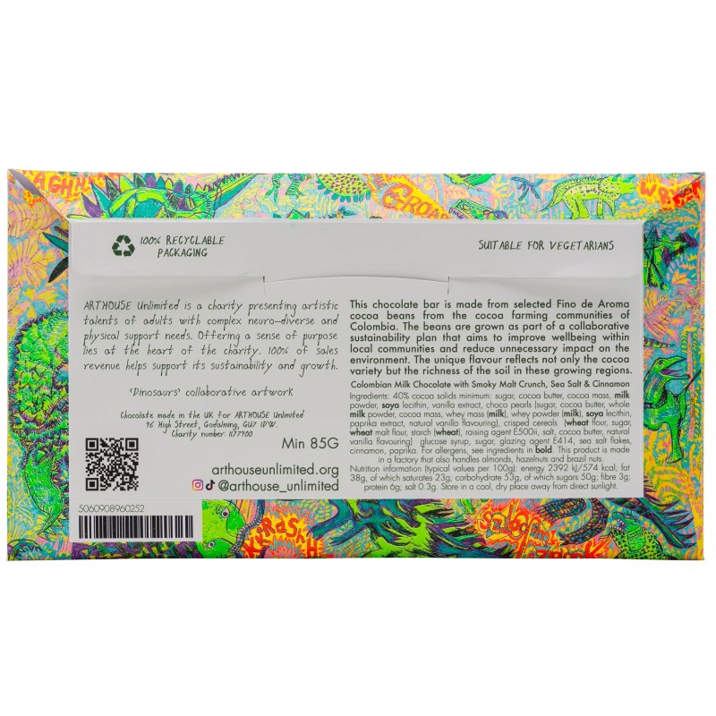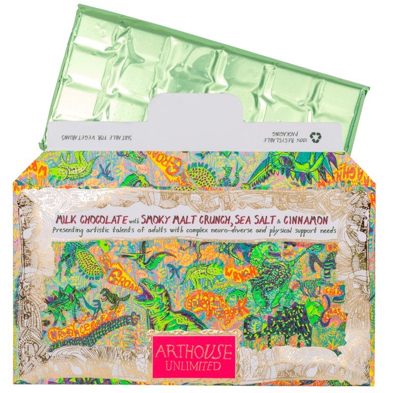 Handcrafted in the UK by a specialist chocolatier using cocoa beans from the Dominican Republic, this chocolate is an indulgent treat for the taste buds. This chocolate features artwork created by a collaboration of ARTHOUSE Unlimited artists.