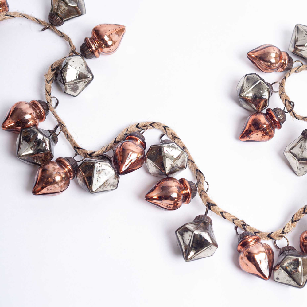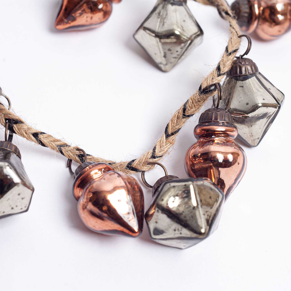 This antique gold and rust colour way combines the refined metallic tones of the recycled glass with elegant shapes that have a nostalgic, vintage appeal and are strung along a natural jute garland for a tactile piece that fits in with any decor.