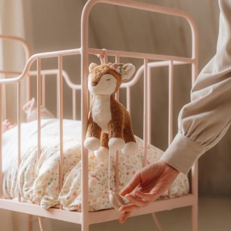This adorable plush deer music box is a gentle and soothing addition to any nursery. With its soft velvety fur, delicate floral accents and calming lullaby, it’s designed to comfort and calm your little one at bedtime.