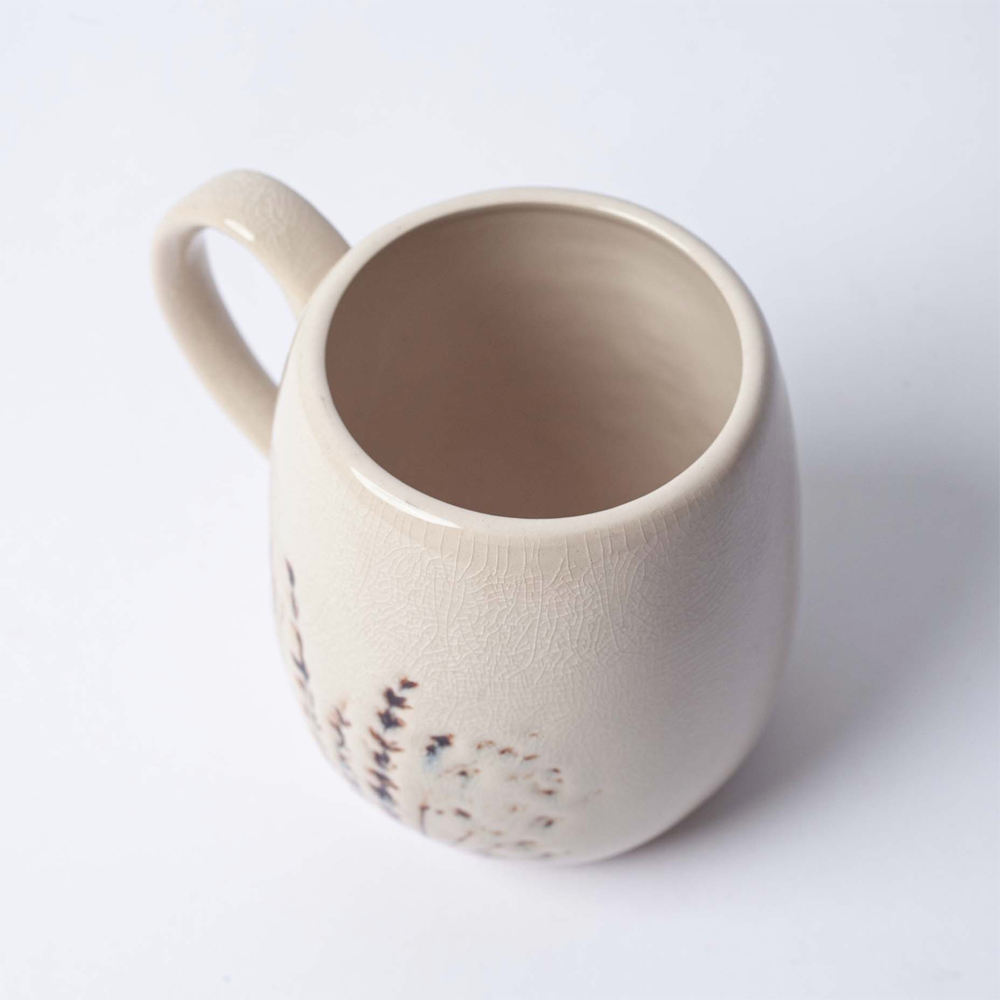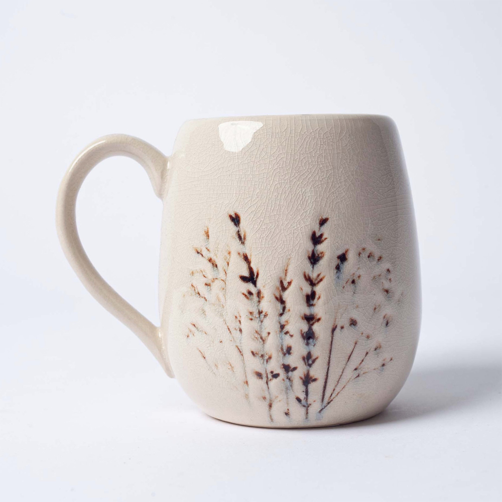 This delicate floral imprint mug is crafted from softly glazed stoneware, featuring an elegant botanical motif and a subtly crackled finish. Perfectly sized for a comforting cuppa, it brings a touch of nature to your tea break.