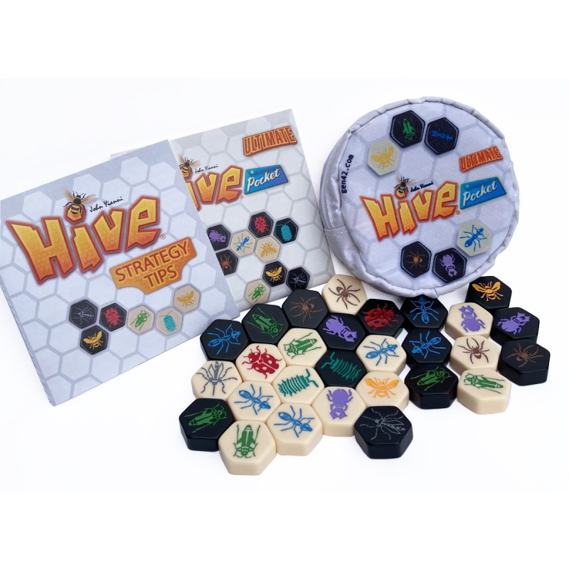 Hive Pocket Ultimate® is the very same wonderful game but now includes all the Expansions: Ladybug & Mosquito and Pillbug. This edition also includes a Strategy Tips booklet and comes in a round zipper bag.