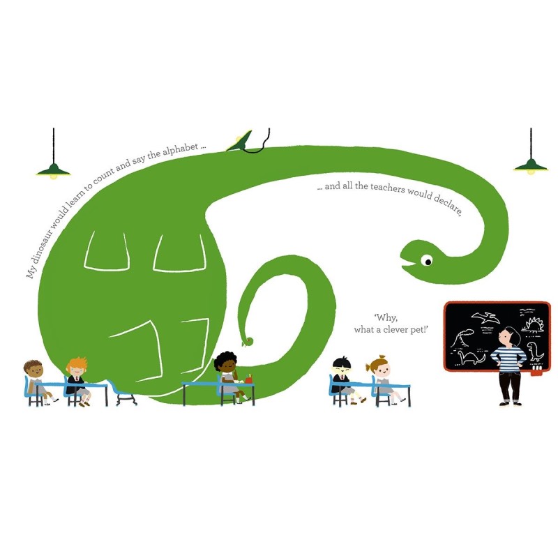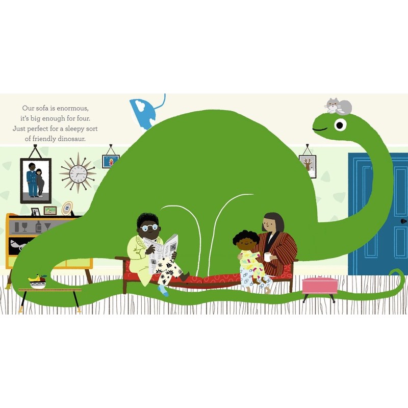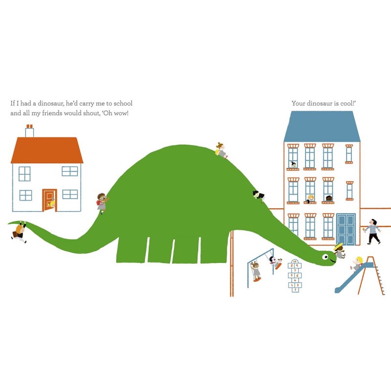 As she plays with her toy dinosaur, inspiration strikes. What about a real, live dinosaur? At the end of a day spent busily imagining, the girl trudges up to bed with her little plastic dinosaur. As she falls asleep, the dinosaur from her daydreams stands in the garden with its head poking through the bedroom window, making her dreams come true.