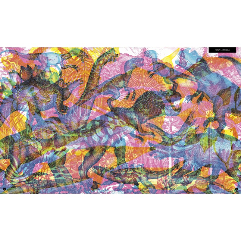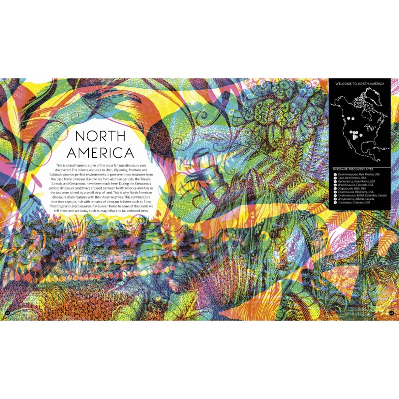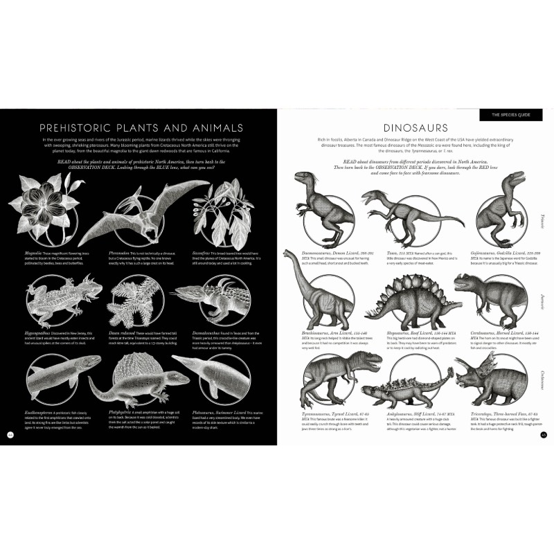 Bring this lost world to kaleidoscopic life with your magic three-colour viewing lens (included): green to reveal locations; red to reveal mighty beasts like velociraptors, a Tyrannosaurus rex and the gigantic brachiosaurus; and blue to uncover the wildlife that lived alongside and after the dinosaurs, including monstrous dragonflies, woolly mammoths and fungi taller than trees.