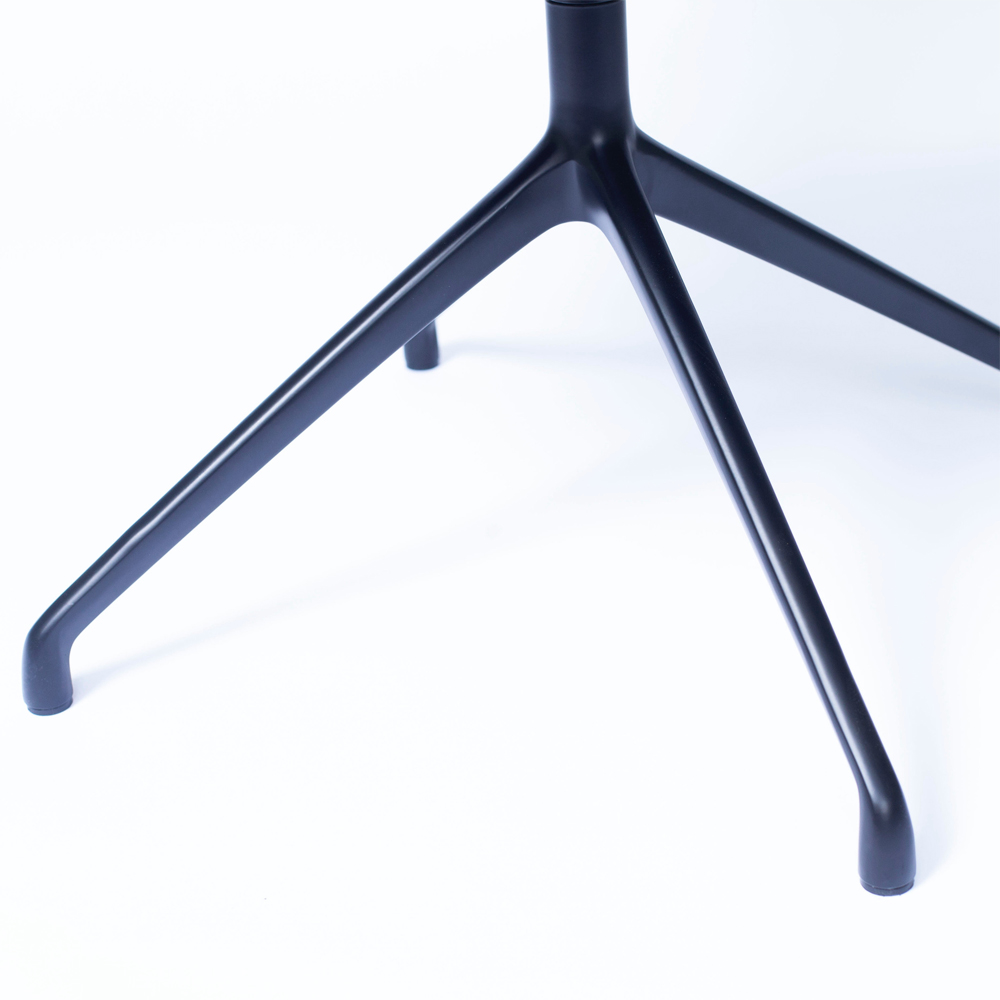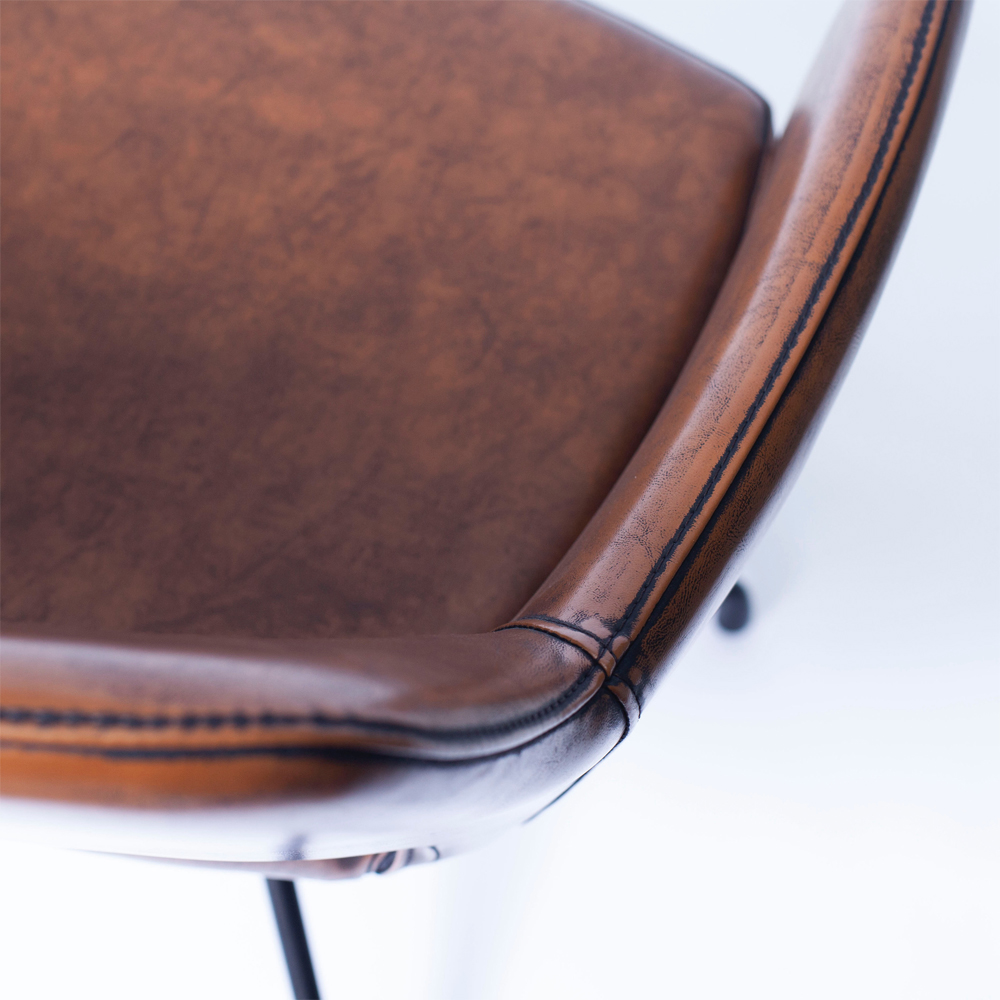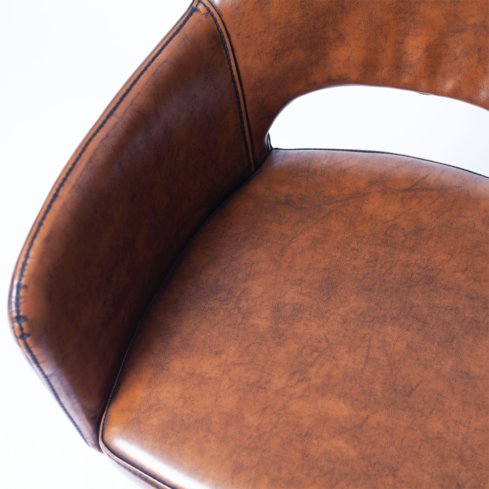 Chair is made from imitation leather, and sits on a swivel pedestal. The whole piece rests on four steel legs off a steel central point.Â