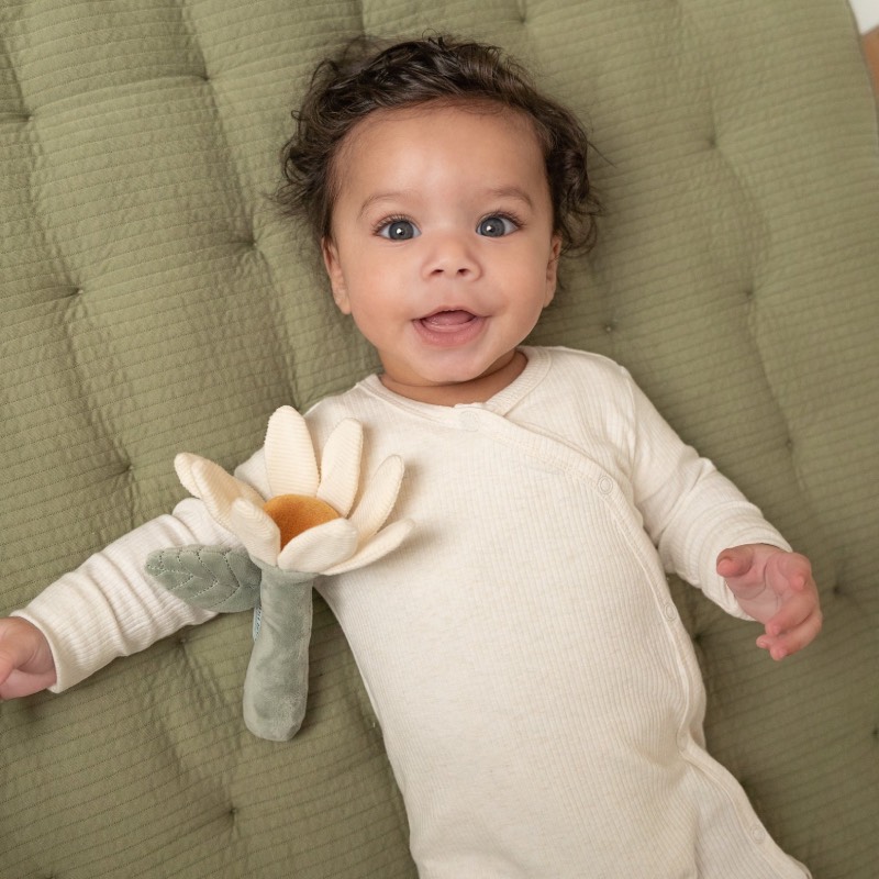 How cute is this rattle in the shape of a flower from the Little Farm collection! When you play with it, you can hear a pleasant sound. There is a hidden crinkle in the flower's petals for extra fun.