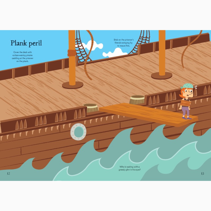 Add stickers to the scenes to help the pirate crew on their swashbuckling adventures as they load their provisions, survive a storm, fight a fierce sea battle, find a treasure map and force their captives to walk the plank.
