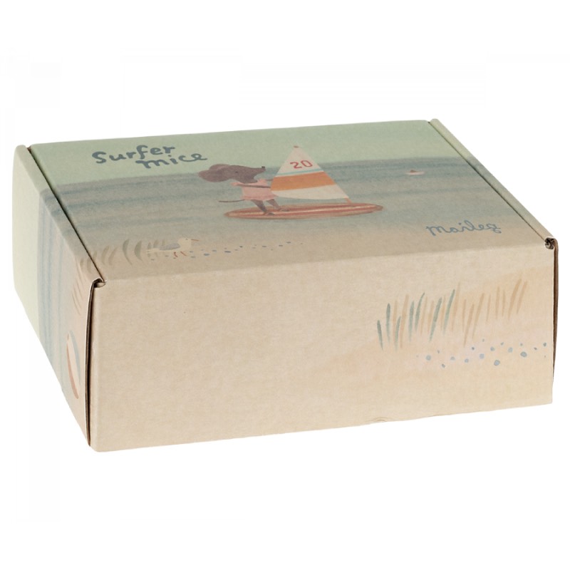 Vacation time. This mouse is ready for a day at the beach. She is wearing a swimsuit and brings her surfboard as she prefers to use the time on the sea. The surfboard and mast are made of wood.