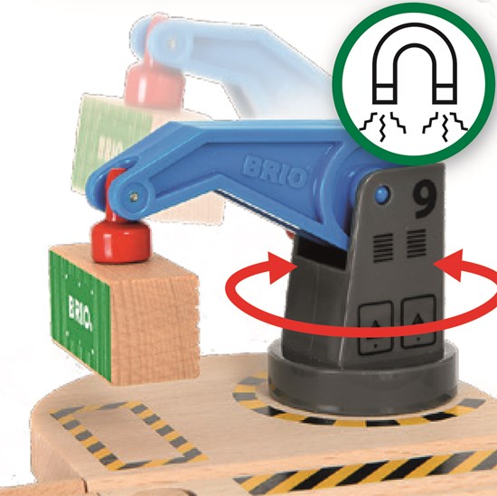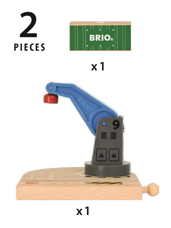 A train is coming fully loaded! Lift the load with the crane – it can handle really heavy loads. Rotate the crane, lower the arm and move the load with help of the magnet into your truck for delivery at home. Oh, here’s the next freight train already! Modern version of the BRIO Low Level Crane for iconic railway play.