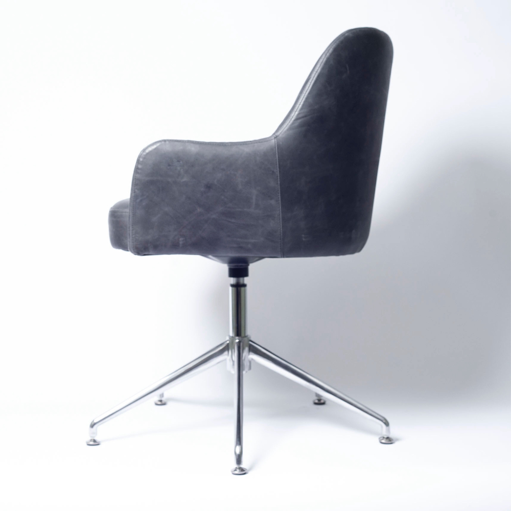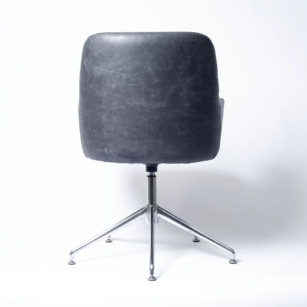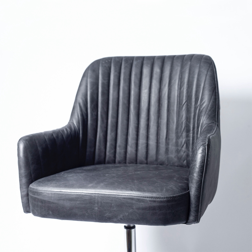 Offers a quality stylish solution to home office working. The chair is upholstered in full leather hide with vertical stitching to add detail and has a lightly padded back and sides and a deep padded seat for comfort. This is paired with a stable base in a classy silver finish. Seat swivels but is not height adjustable.