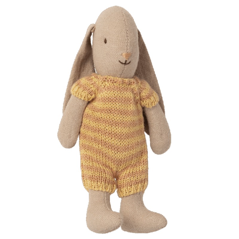 This sweet bunny in micro size wears a striped suit knitted in a soft linen/cotton blend. It fits all the micro-size furniture and will secure many hours of play.