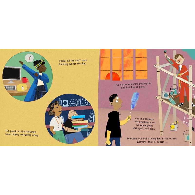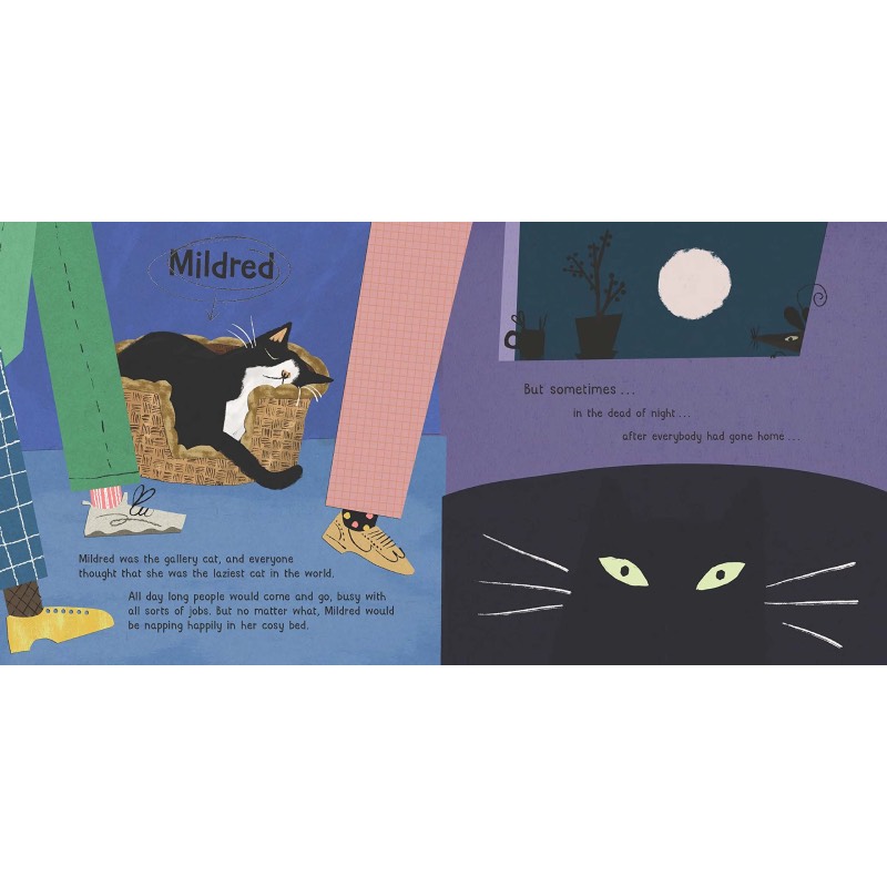 In a grand gallery, in a little basket, there lies a very sleepy cat named Mildred. Everyone thinks she is the laziest cat in the world, but sometimes, in the dead of night, she sneaks into the empty gallery.