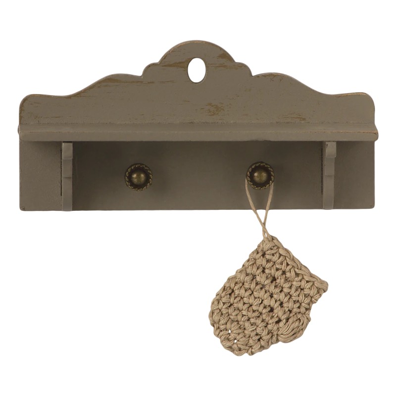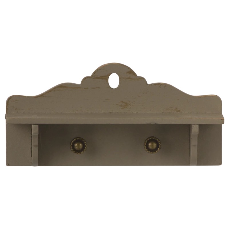 A charming miniature shelf in muted taupe, perfectly scaled for Maileg’s delightful dollhouse universe. Complete with two brass-effect pegs and gently aged detailing, it’s ideal for displaying tiny treasures or hanging miniature accessories.