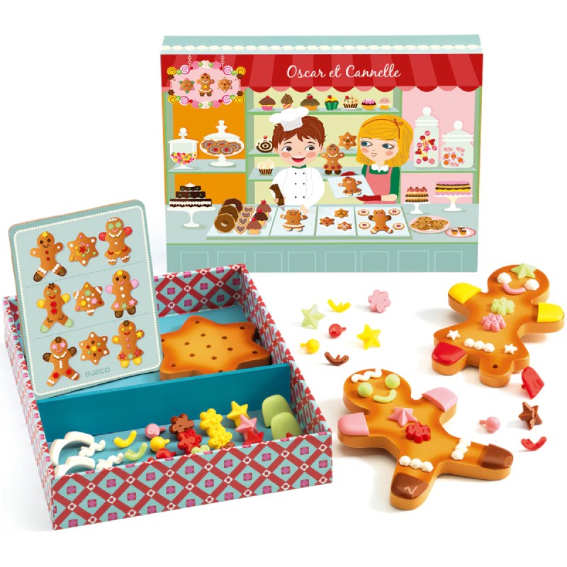 Decorate-your-own gingerbread biscuits set, complete with sweet accessories. This playful kit allows little ones to create a variety of fun shortbread characters with colourful toppings and decorations. With charming gingerbread shapes, delightful embellishments, and an illustrated box that doubles as a bakery counter, this set is perfect for sparking creative role-play.