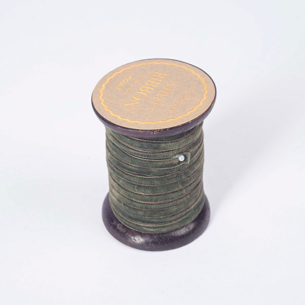 - / Reel Of Velvet Ribbon On Wooden Spool In Olive Green 10M