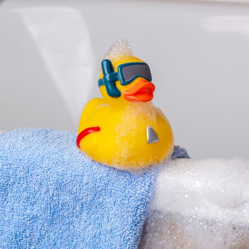 Classic duck bath toy, in yellow. Perfectly sized and weighted to float on the water's surface, this intrepid explorer duck, complete with diving goggles and snorkel, is ideal for little ones' bath time play.