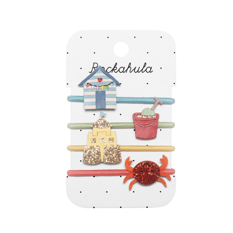 All things fun at the beach adorn this set of four ponies. With a striped beach hut, a bucket and spade, a sweet snappy crab and a glittery sandcastle all on bright coloured elastics!