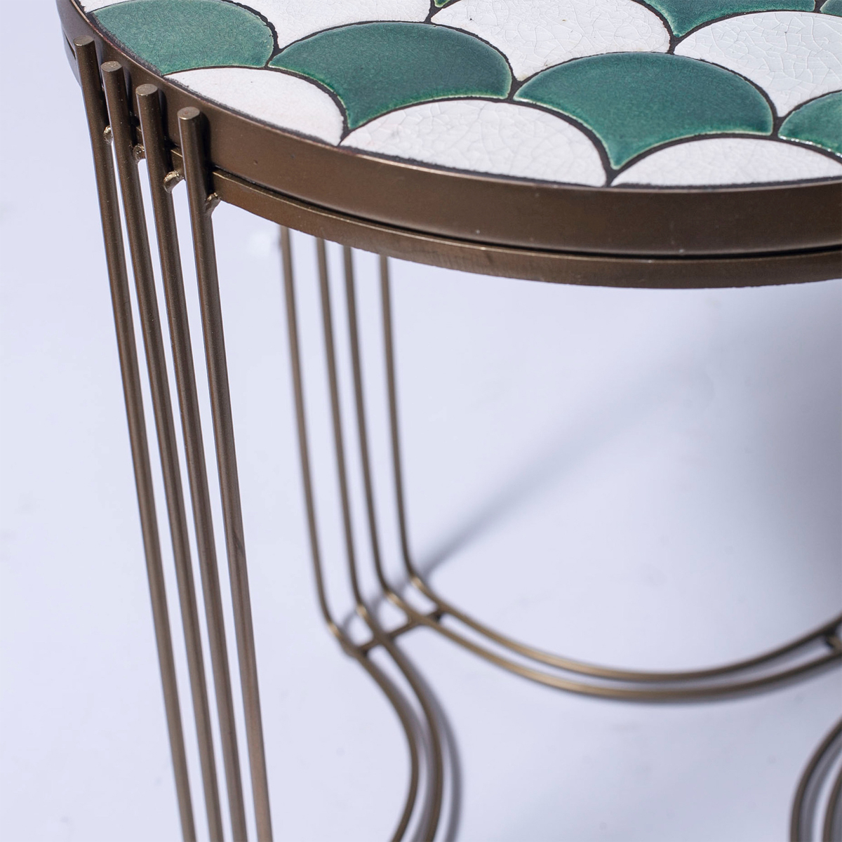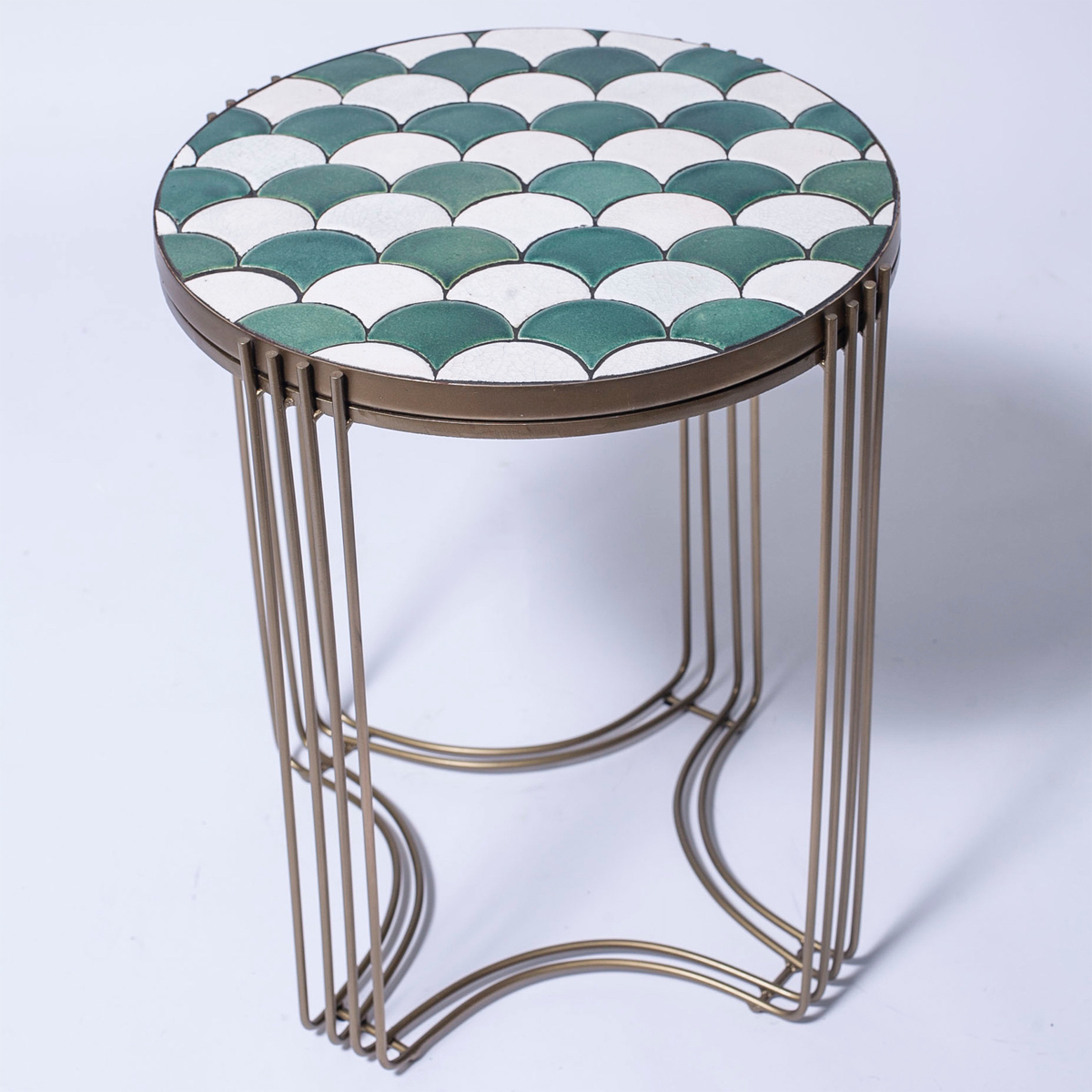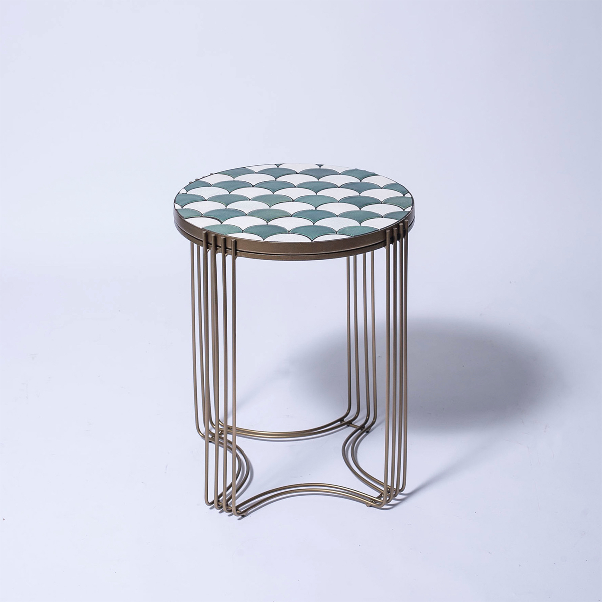 A metal side table, with a fish scale patterned, ceramic tiled top, and Art Deco inspired legs.