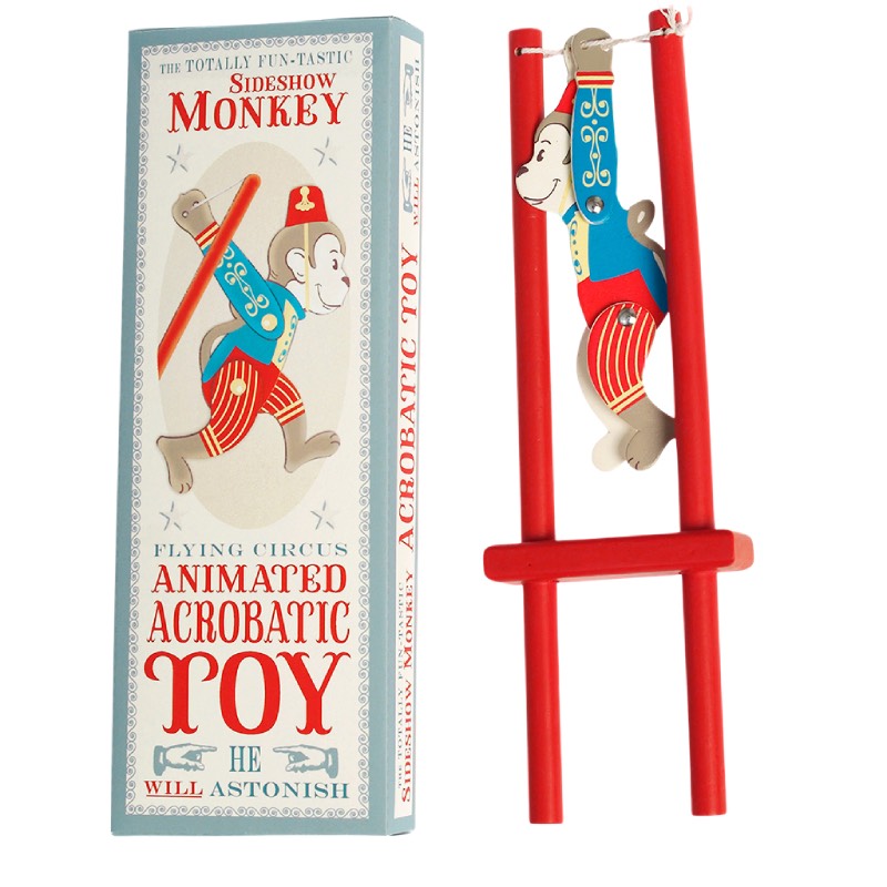 Children will be amazed by this traditional toy! Say hello to the totally trapeze-tastic sideshow monkey acrobatic trapeze toy. Simply squeeze the handle to make the cheeky monkey perform his fantastic feats.